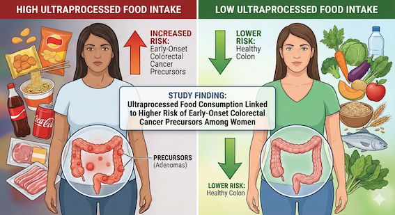 Wang C, Du M, Kim H, et al. Ultraprocessed Food Consumption and Risk of Early-Onset Colorectal Cancer Precursors Among Women. JAMA Oncol. Published online November 13, 2025. doi:10.1001/jamaoncol.2025.4777