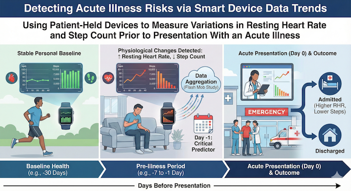 救急外来を訪れる患者の多くは、受診の数日前から生理学的な変調をきたしています。本研究は、患者が日常的に携行するスマートデバイスから安静時心拍数と歩数の推移を抽出し、入院予測における有用性を検証した国際多施設共同研究です。