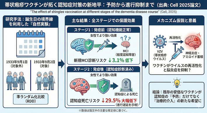 認知症。この不可逆的な神経変性疾患は、現代医学において最も厚く、そして高い壁として立ちはだかってきました。アミロイドベータやタウタンパク質といった特定の分子標的に対する創薬研究がしのぎを削る中、今、全く異なるアプローチが世界に衝撃を与えています。それは、私たちが日常的に「帯状疱疹の予防」として認識してきたワクチンが、認知症の発症のみならず、その進行過程全体を劇的に変化させる可能性を示唆したことです。スタンフォード大学のパスカル・ゲルドセッツァー博士らによる最新の研究は、因果関係の特定が極めて困難とされる疫学研究において、自然実験という巧妙な手法を用いてこの厚い壁に風穴を開けました。