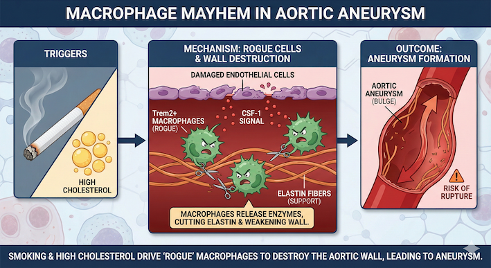 静かなる殺し屋、大動脈瘤。それは血管壁が長い時間をかけて脆弱化し、大動脈が突如として決壊、失血死へと至る最悪のシナリオを秘めた疾患です。これまで、遺伝性疾患を除けば、動脈硬化、高血圧、そして何よりも喫煙が強力なリスク因子として知られてきました。しかし、なぜ喫煙がこれほどまでに瘤の形成と破裂を加速させるのか、その具体的な細胞・分子動態は長い間、霧の中にありました。JACC誌に掲載されたMatthias Nahrendorf博士らのエディトリアルは、Thayaparanらによる研究(Nat Immunol. 2025 May;26(5):706-721.)をもとに、マクロファージが血管壁を破壊する「暴走(Mayhem)」のメカニズムを解説しています。