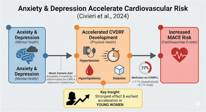 Civieri G, Abohashem S, Grewal SS, et al. Anxiety and Depression Associated With Increased Cardiovascular Disease Risk Through Accelerated Development of Risk Factors. JACC Adv. 2024;3(9):101208. doi:10.1016/j.jacadv.2024.101208