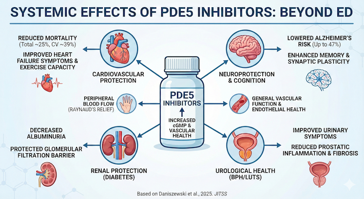 Daniszewski, W., Knobelsdorf, W., Furtak, G., Łagódka, M., Pogoda, M., Zając, K., Pietrzyk, D., Oder, B., Ćmil, M., & Karchut, W. (2025). Systemic Effects of Phosphodiesterase Type 5 Inhibitors Beyond Erectile Dysfunction: A Narrative Review. JITSS (Journal of Innovation and Trend in Social Sciences), 2(2), 87-100. https://doi.org/10.63203/jitss.v212.376.
