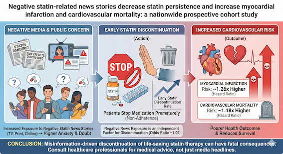 Nielsen SF, Nordestgaard BG. Negative statin-related news stories decrease statin persistence and increase myocardial infarction and cardiovascular mortality: a nationwide prospective cohort study. Eur Heart J. 2016;37(11):908-916. doi:10.1093/eurheartj/ehv641