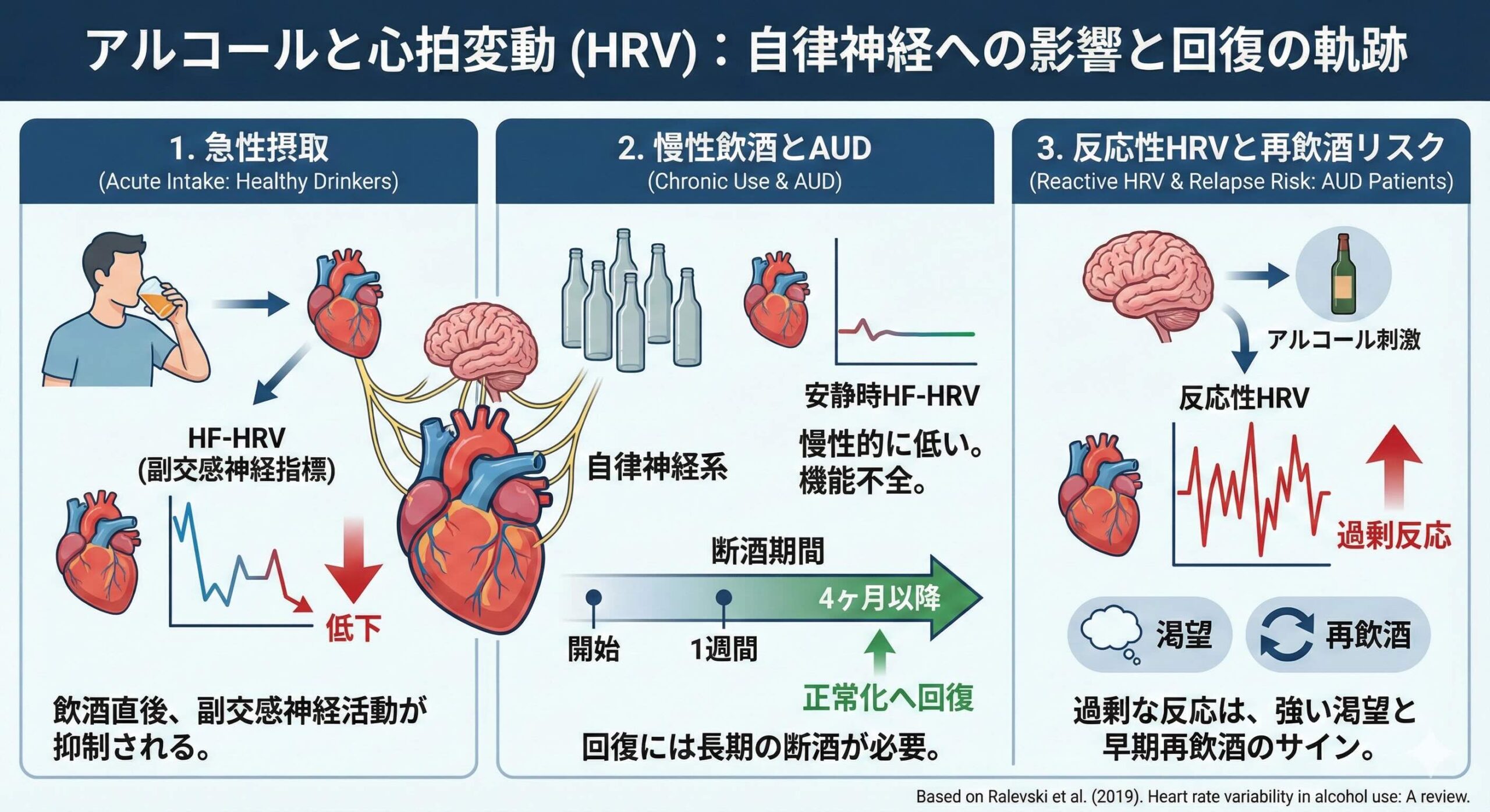 急性飲酒は健常者でもHF-HRVを下げやすく、慢性大量飲酒やAUDでは安静時HF-HRVが下がり、回復には少なくとも4か月以上の断酒が必要になりうる。一方で反応性HRVは、断酒後も長く残る過大反応として観察され、渇望や再飲酒の速さ、ネガティブ気分と結びつく可能性がある。