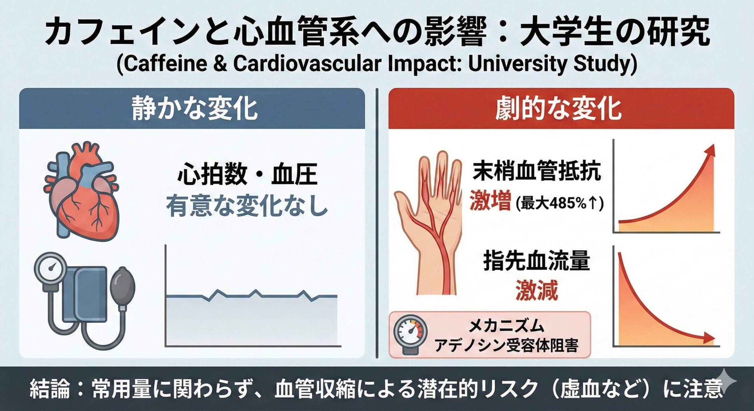 本論文は、カフェインがもたらす血管収縮が、単なる末梢の冷えに留まらないリスクを孕んでいることを警告しています。特に注目すべきは、虚血後の血流再開を担う反応性充血への影響です。