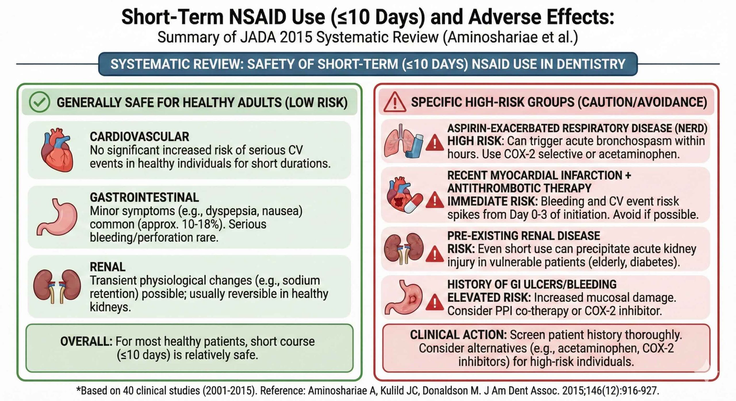 Aminoshariae A, Kulild JC, Donaldson M. Short-term use of nonsteroidal anti-inflammatory drugs and adverse effects: An updated systematic review. J Am Dent Assoc. 2015. doi:10.1016/j.adaj.2015.07.020