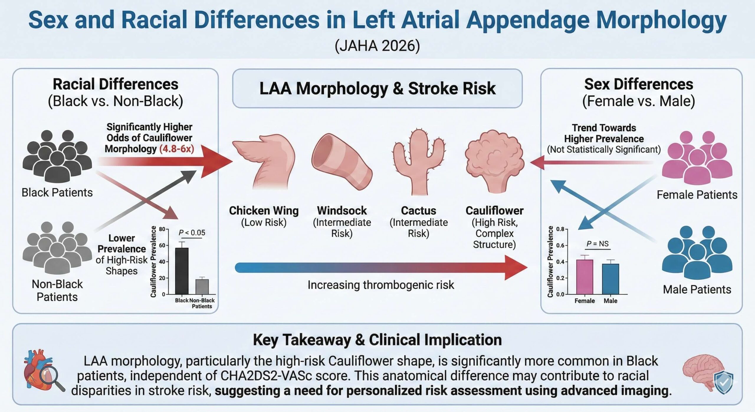 Wahaj A, Mauri ME, Bocchese MJ, Quinn AGG, Yu D, Lu X, Garber RS, Yesenosky GA, Basil A, Fiss DM, et al. Sex and Racial Differences in Left Atrial Appendage Morphology. J Am Heart Assoc. 2026;15:e042619. doi: 10.1161/JAHA.125.042619.