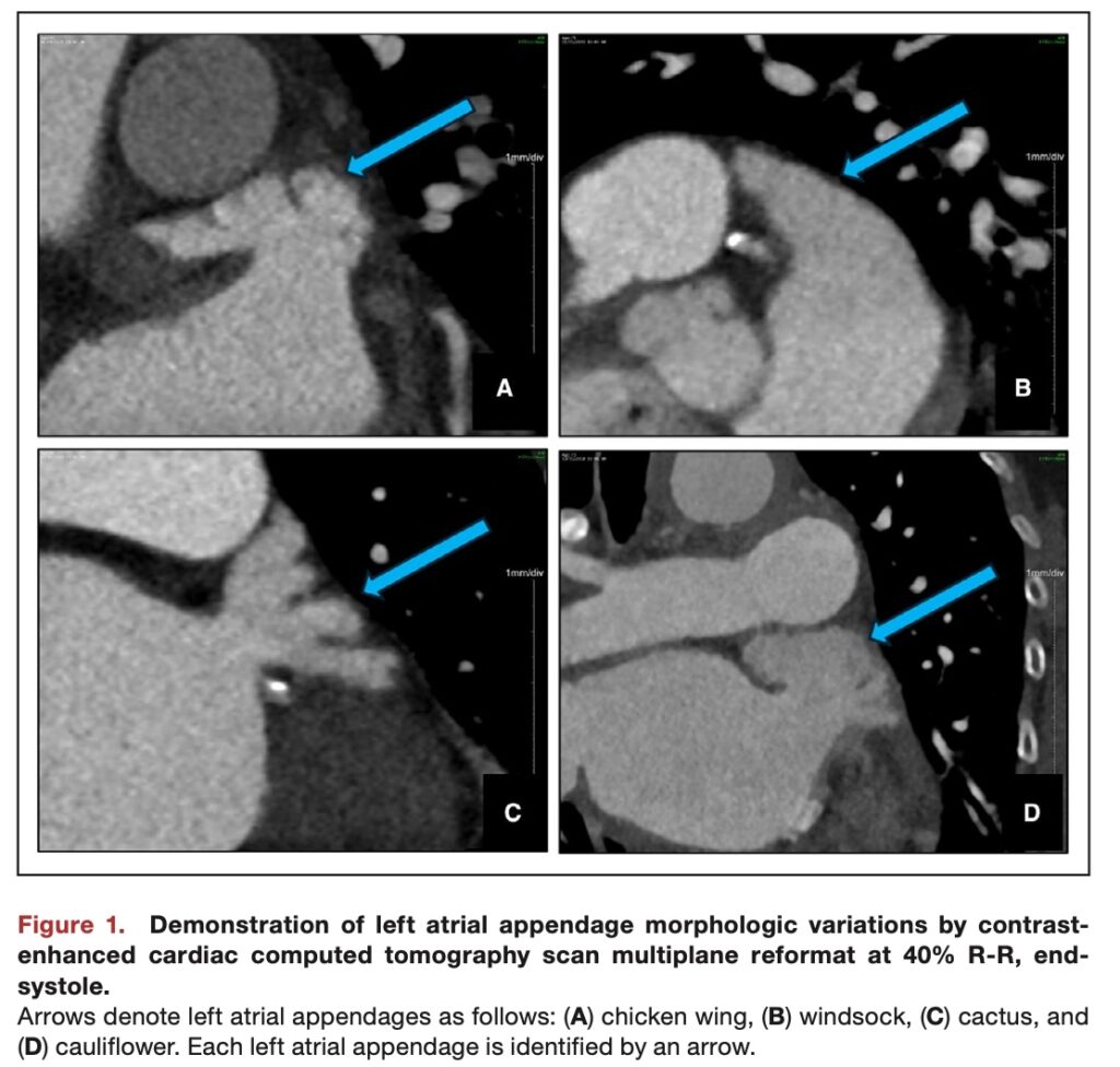 心房細動における脳卒中リスクの評価において、左心耳は血栓形成の主戦場として知られています。特に左心耳の複雑な形態は、内部の血流停滞を引き起こし、血栓形成を促進します。過去の研究では、左心耳の形状を4つの典型的なカテゴリーに分類し、脳卒中リスクとの関連を論じてきました。最も低リスクとされるのが「チキンウィング(手羽先)型」であり、一方で最も高リスクとされるのが多房性で複雑な構造を持つ「カリフラワー型」です。