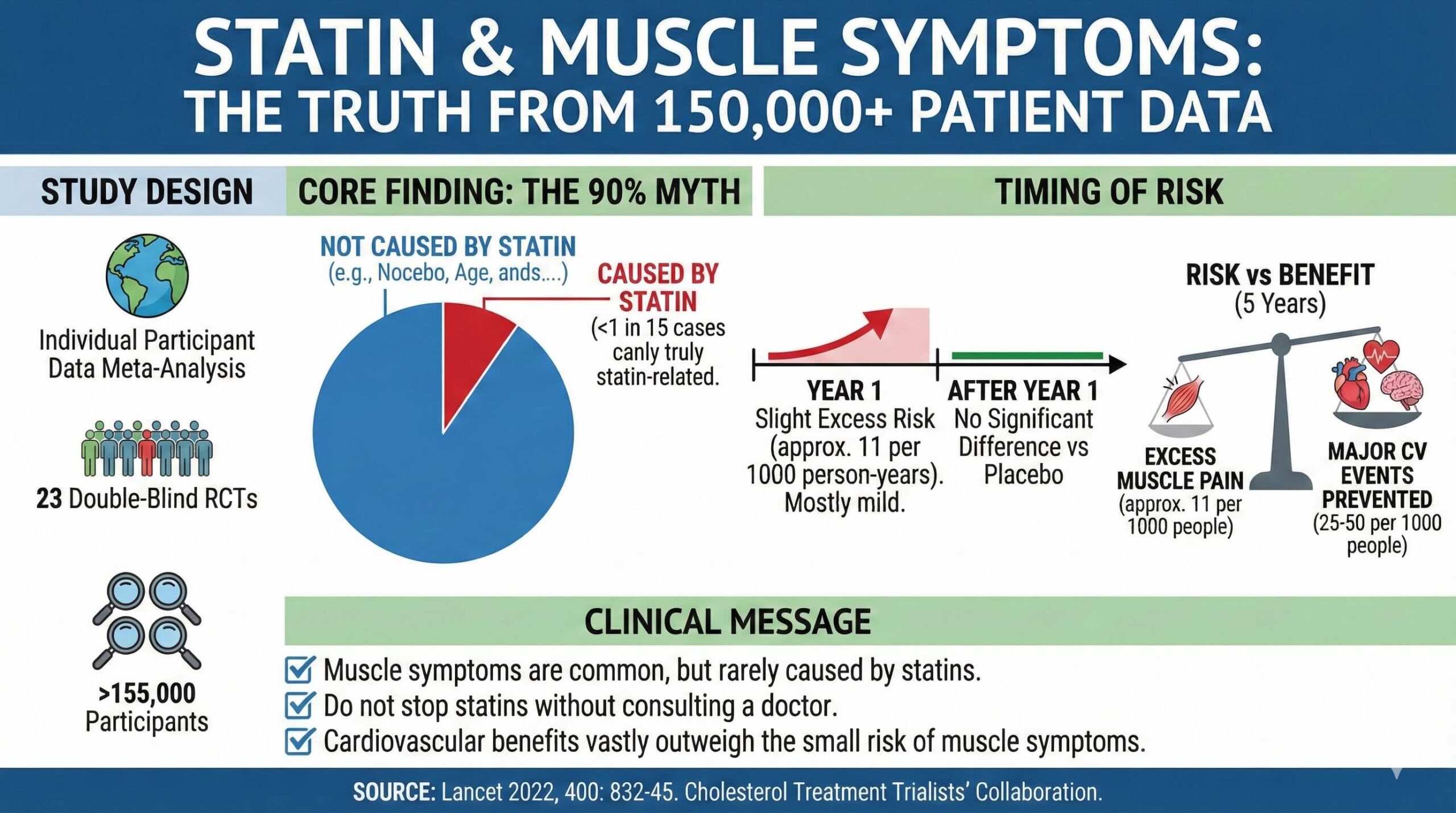 Cholesterol Treatment Trialists’ Collaboration. Effect of statin therapy on muscle symptoms: an individual participant data meta-analysis of large-scale, randomised, double-blind trials. Lancet 2022; 400: 832-45. DOI: 10.1016/S0140-6736(22)01545-8.