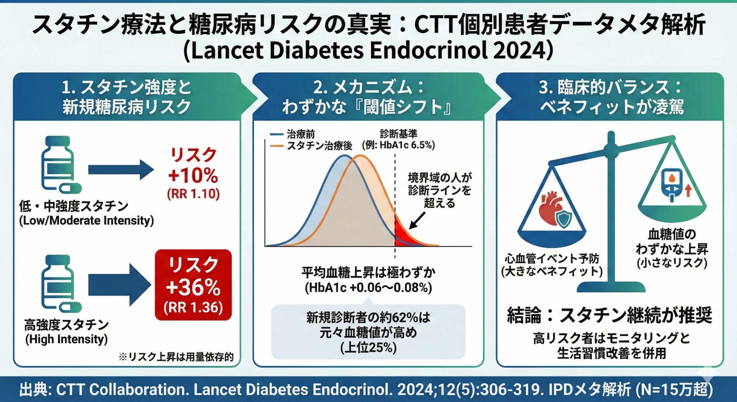 本稿では、2024年にLancet Diabetes & Endocrinology誌に掲載された、コレステロール・トリートメント・トライアリスト(Cholesterol Treatment Trialists’ ; CTT)コラボレーションによる最新の個別患者データ(IPD)メタ解析をもとに、スタチンと血糖代謝の複雑な関係を解き明かしていきます。