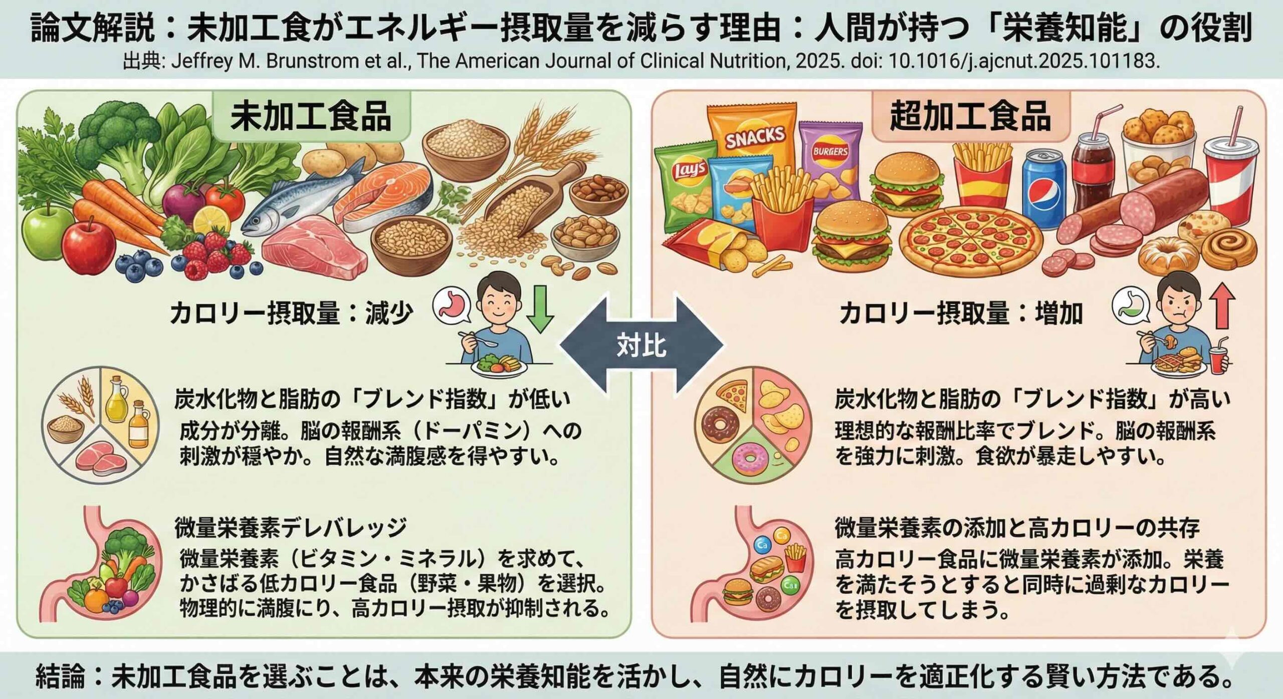 2019年、ケビン・ホール博士らが発表した「超加工食品が摂取カロリーを増大させる」という衝撃的な報告は、世界中の栄養学研究者や公衆衛生当局を驚かせました。しかし、なぜ未加工の食事を摂ると、私たちは意志力に頼ることなく、自然とエネルギー摂取量を抑えることができるのか。その本質的な理由は、長らく謎のままでした。今回、ブリストル大学のジェフリー・ブルンストロム教授らによって発表された最新の事後解析は、人間に備わった「“nutritional intelligence” 栄養知能」という新たな視点から、この謎を解き明かす画期的な知見を提示しています。