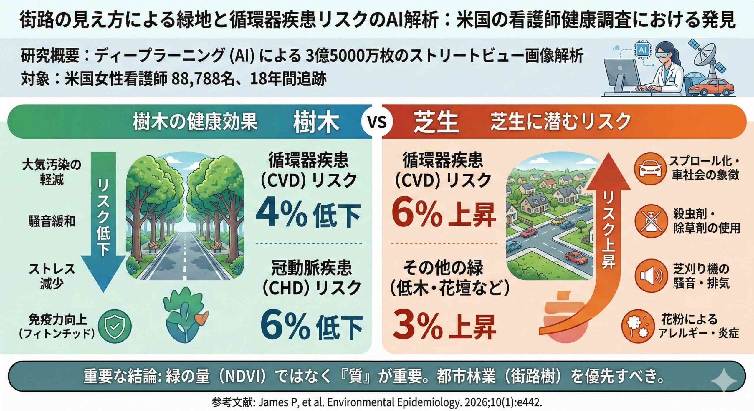 最新のEnvironmental Epidemiology誌に掲載されたこの研究は、AI(ディープラーニング)を用いて全米350万地点、計3億5000万枚ものストリートビュー画像を解析するという、前代未聞のスケールでこの問いに挑みました。その結果は、これまでの「緑地=善」という一元的な理解を鋭く批判し、緑の種類によって健康への影響が劇的に異なることを浮き彫りにしています。