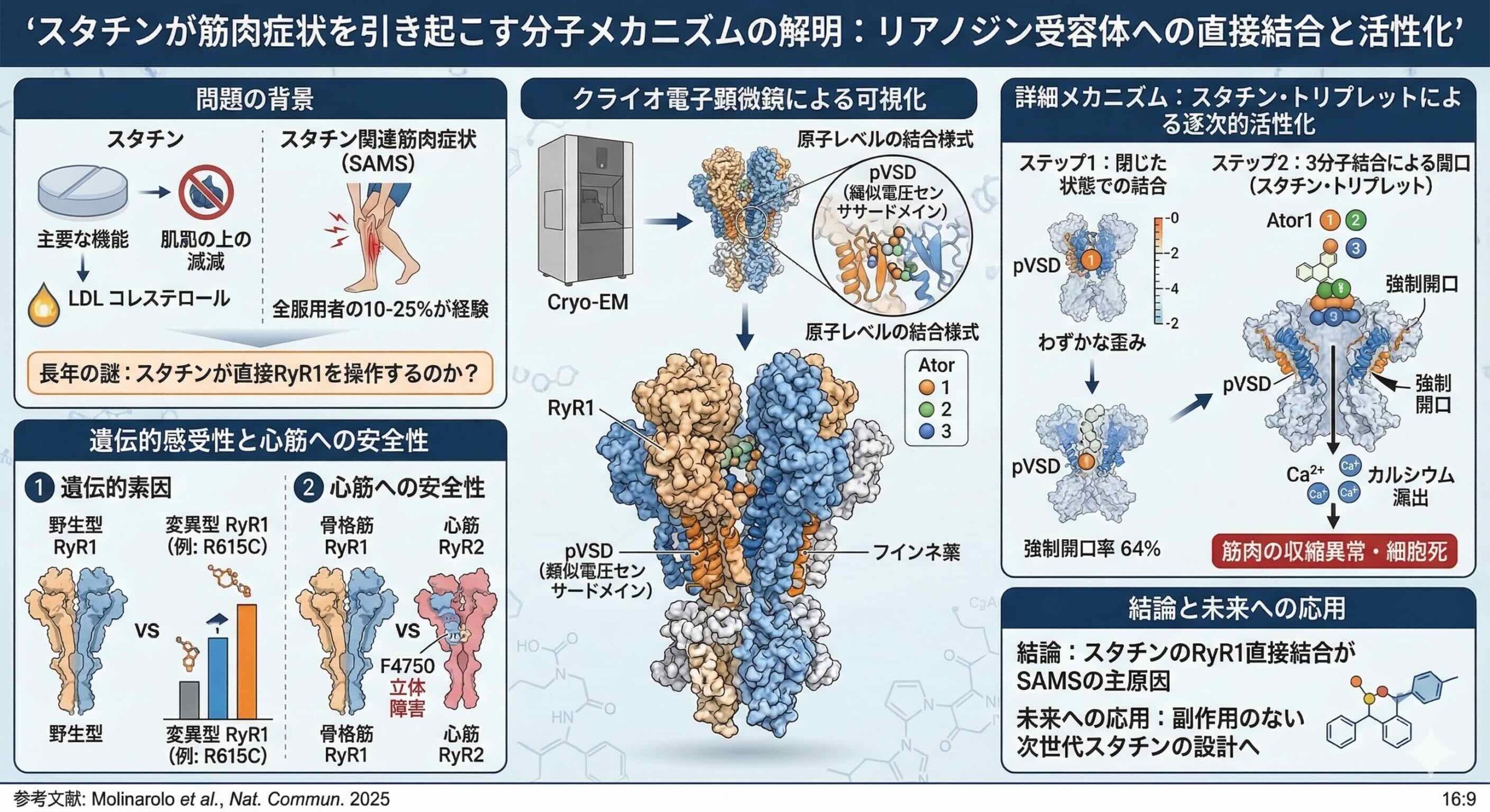 脂質異常症治療において、スタチンは心血管疾患リスクを劇的に低下させる「21世紀の特効薬」として君臨しています。現在、世界中で2億人以上の患者に処方されていますが、その輝かしい功績の影で、長年議論されてきたのがスタチン関連筋肉症状(SAMS)です。全服用者の10%から25%が、軽度の筋肉痛から致死的な横紋筋融解症に至るまで、何らかの筋肉トラブルを経験しています。これまでの研究で、骨格筋のカルシウム放出を司るリアノジン受容体1型(RyR1(Ryanodine Receptor 1 ))の遺伝子変異がスタチン不耐症と相関することは知られていましたが、スタチンがRyR1に直接結合し、その機能を操作しているのかという点については、決定的な証拠が欠けていました。