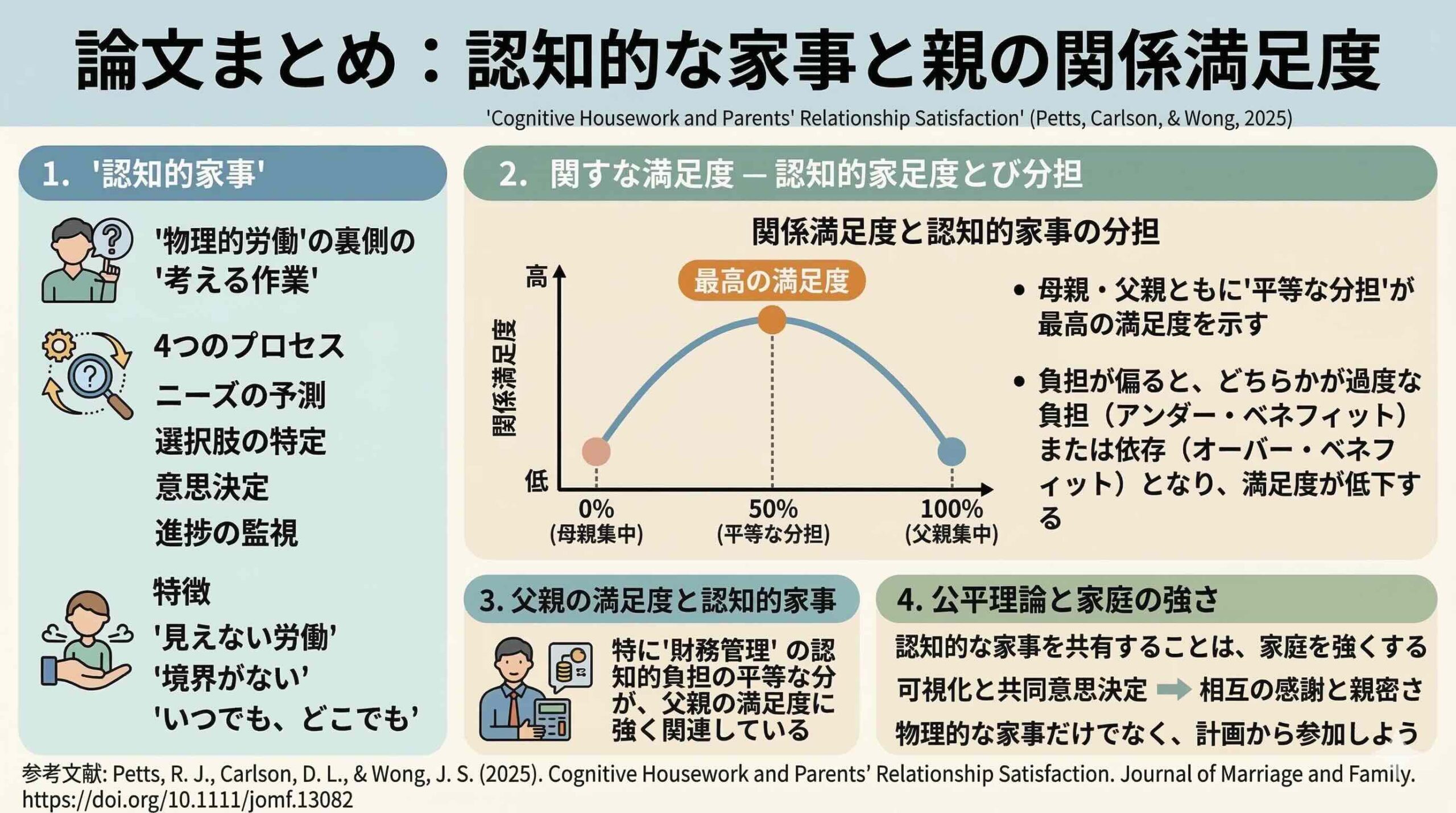 本研究の新規性は、認知的な家事を単一の指標ではなく、ルーチン家事、修繕、親族付き合い、財務という多角的なドメインで測定し、そのそれぞれが満足度に与える影響を分離した点にあります。過去の研究(Cicolla & Luthar, 2019など)は主に母親の視点に限定されていましたが、本研究は父親の視点も含めたペアの力学を解析しました。