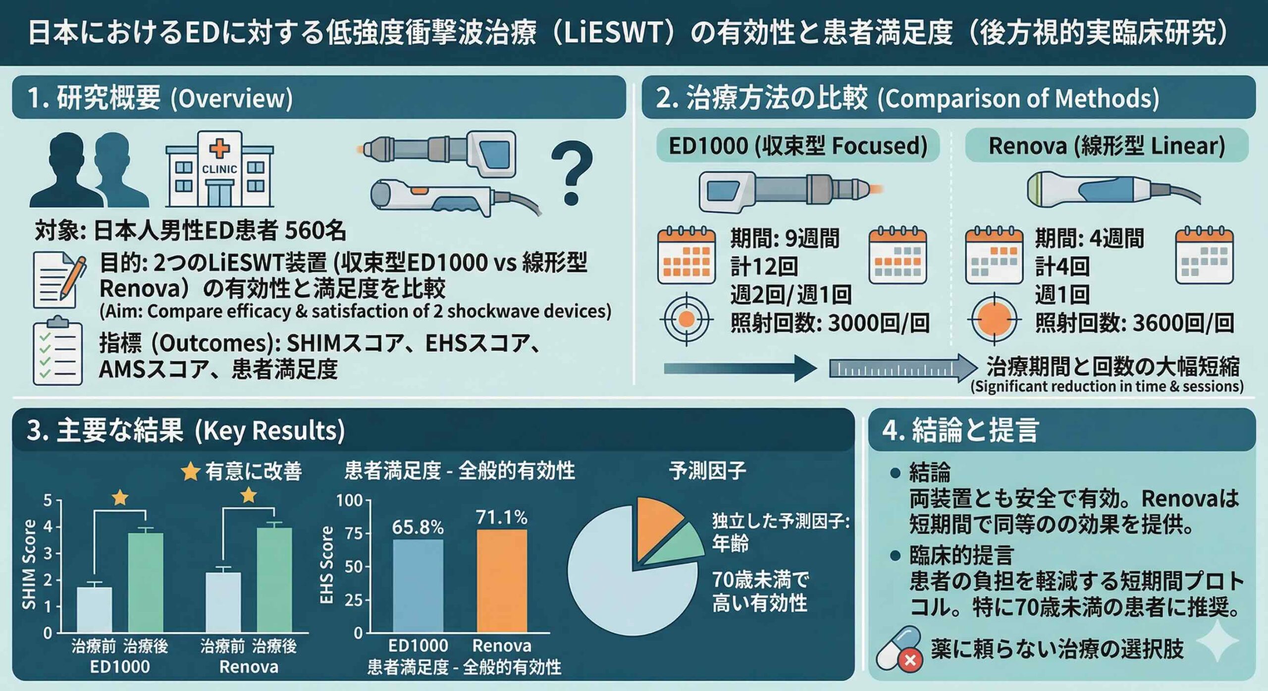 第二に、PDE5Iで満足な結果が得られなかったとしても、諦める必要はないということです。本研究にはPDE5I非反応例も含まれており、そのような患者に対してもLiESWTが福音となる可能性が示されています。