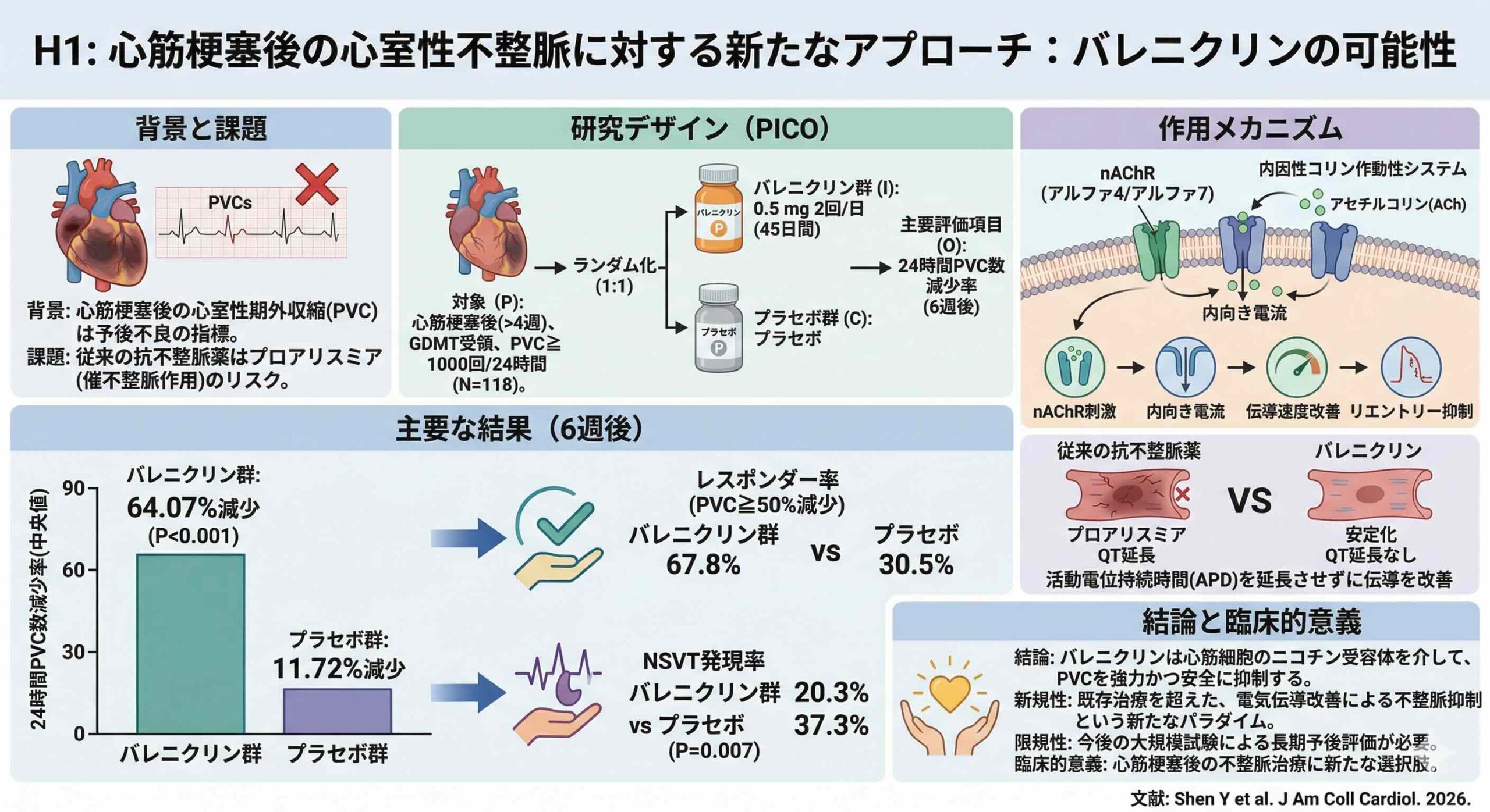 Shen Y, Guo X, Zeng C, et al. Varenicline and Ventricular Ectopy After Myocardial Infarction: A Randomized Phase 2 Study. J Am Coll Cardiol. 2026; (in press). doi: 10.1016/j.jacc.2025.12.090.
