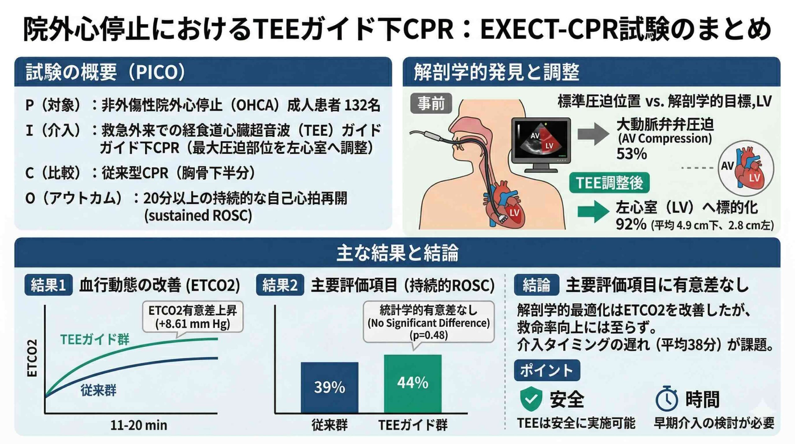 本試験では予後改善に至りませんでしたが、TEEが心停止下でも安全に(食道損傷などを増やすことなく)実施可能であり、かつ極めて正確に心臓の動態を可視化できることが証明されました 。心停止の原因検索(肺塞栓症や心タンポナーデなど)や、ECMOカニューレの留置ガイドとしてのTEEの役割は、今後さらに重要性を増すでしょう 。