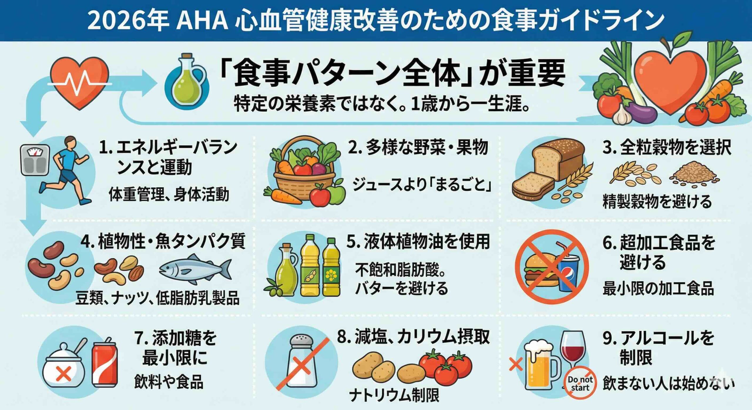 かつての栄養学は、ビタミンCや飽和脂肪酸といった「個別の栄養素」に焦点を当てる傾向がありました。しかし、2026年のAHA声明が強調するのは、食品単体ではなく、日々の生活で形成される包括的な食事パターンです。質の低い食事は、心血管疾患(CVD)の発症率および死亡率の上昇と密接に関連しており、これを改善することは公衆衛生上の最優先課題です。本ガイドラインは、特定の「ダイエット法」を推奨するものではなく、文化的背景や個人の嗜好に柔軟に対応しながらも、科学的に証明された心血管保護機能を持つ食事の「特徴」を定義しています。