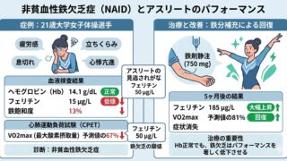 はじめに 鉄欠乏といえば、多くの臨床医やアスリートは「ヘモグロビン(Hb)値の低下」、すなわち貧血を連想します。しかし、本論文は、Hb値が正常であっても鉄貯蔵が枯渇しているだけで、アスリートのパフォーマンスが劇的に、そして不可逆的とも思える...